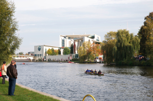 Tiergartens nordliga avgränsning. Fortsättningsvis möter vi sköna vyer och lär känna Berlin från en för många ovanlig sida. Vi passerar bl a Kongresshalle, som ligger på flodens högra sida. Snart känns allt bekant för den som gjort vandring 3 (Murvandingen), ty nu är vi åter vid Hauptbahnhof och framför Förbundsrepublikens nya officiella byggnader på andra sidan Spree.